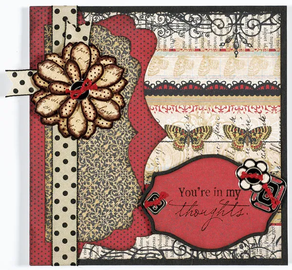 Trace and cut the tiny label from Noted red paper and stamp “you’re in my thoughts.” Mat on cardstock with 1/16" borders, then foam tape at the lower right. Place two Dazzles™ 5/8" buttons on Noted papers, one on tan and one on dotted, then cut around the edges. Glue to the label on the right end, then place a small button on the left end and one on the flower center. Knot threads and glue to the centers of the label buttons. Tie a thread bow and glue to the flower button center.