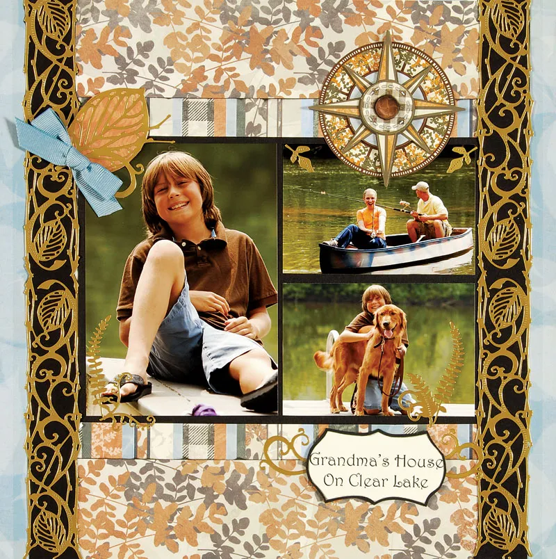 Background: For the left page: Glue an 81/2” x11 1/2” piece of orange/gray leaves paper to the center of 12”x12” black cardstock. Glue 1 1/2” x 11 1/2” strips of blue leaves paper to the outsides edges of the orange/gray leaves paper. Glue a 8 1/2”x6” rectangle of black cardstock to the center of the orange/gray leaves paper with 8 1/2” x 3/4” strips of striped paper at the top and bottom edge. Place 2 leaves borders end to end on 12” long black cardstock and cut close to the long edges. Glue to the right of the black rectangle, extending the length of the page. Repeat for a second border.