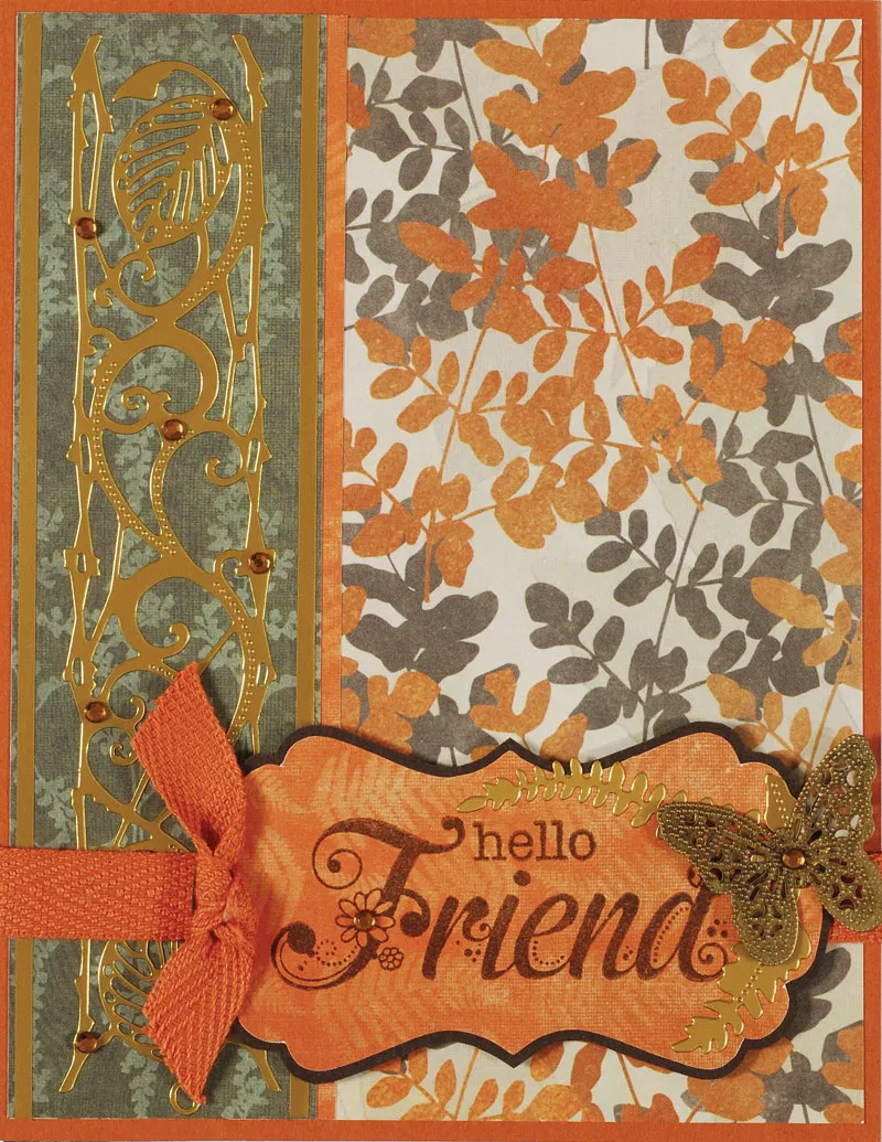 Use the template to trace and cut bracket Label A from North Country orange paper and stamp “hello Friend” on it. Mat on gray cardstock with 1/16" borders, then place three small Dazzles™ ferns on the right end. Foam tape the label to the twill on the lower right, then use Ultra tape to attach a butterfly as shown. Knot 4" twill, trim the ends and glue to the label’s left end. Place rhinestones as shown.