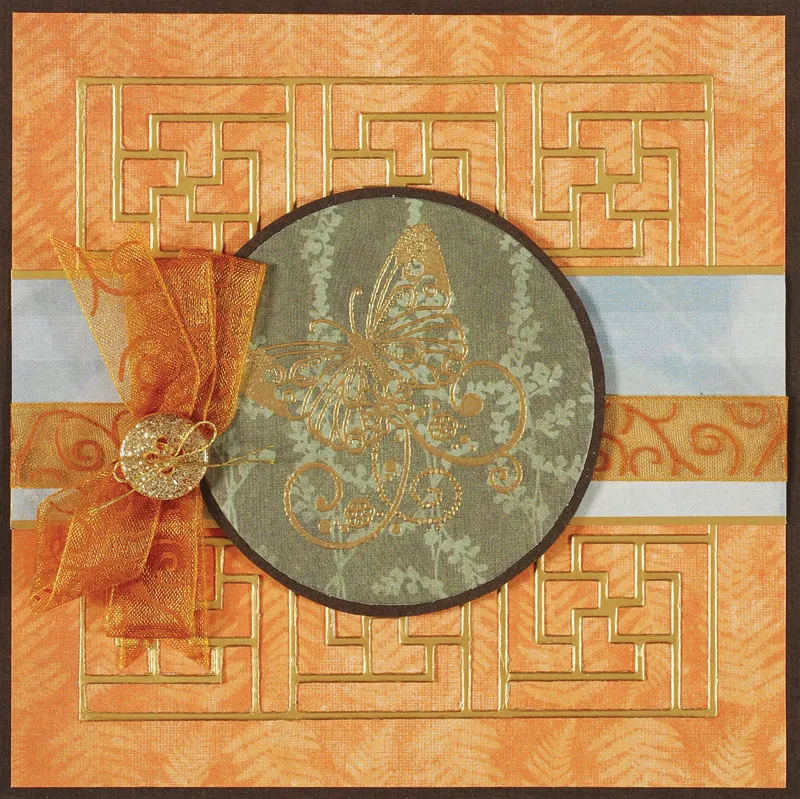 For the card front: Place the card with the fold on top and trim to a 5" square. Cover the front with dark gray cardstock. Cut a 4¾" square North Country orange paper and glue centered on the front. Die cut the lattice from gold paper and use craft glue to attach it to the center front.