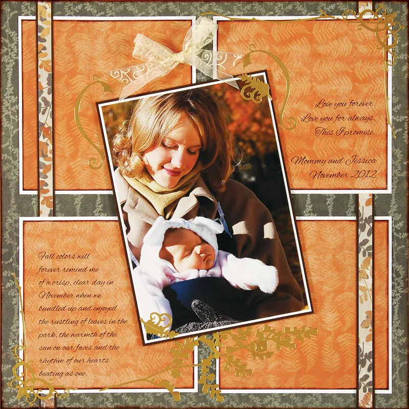Using 22 pt., journal sentiment on a North Country orange square, 1/2” from lower left edges. Place 1/2” from edges on lower left corner. Using 22 and 24 pt., journal saying and title on a North Country orange square, 1/2” from lower right edges. Place 1/2” from edges on upper right corner.