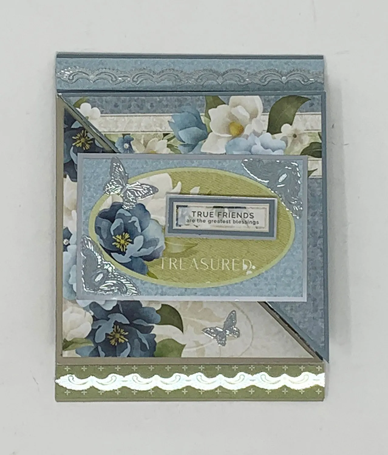 Cut 3¼"x2" Magnolia Blossoms light blue tapestry cardstock and mat it on Silver paper with 1/16" borders. Punch out the Magnolia Blossoms “treasured” label and glue it to the center. Cut out the “true friends…” label. Mat it on medium blue cardstock with 1/8" borders, then on Silver paper with 1/16" borders. Foam tape it to the label and place silver Dazzles™ as shown. Center the label on the card and glue it just to the upper blue triangular panel.