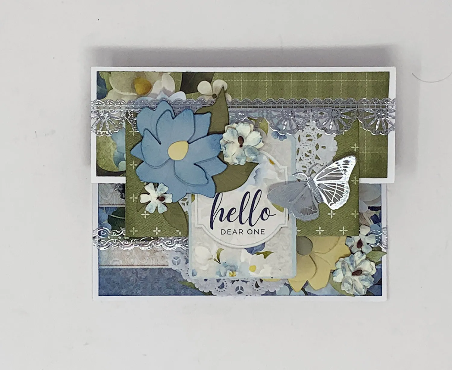 For the front: Punch out the Magnolia Blossoms “hello dear one” tag and glue it to the green cardstock, aligning the top with the z-folded cardstock’s top edge. Place a silver border Dazzles™ across the card front, aligning it with the top of the green cardstock z-panel and trimming the excess.