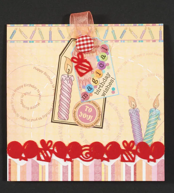 Cut out the yellow candle tag, the "magical birthday wishes" tag, and the "to you" circle art. Glue them together, positioned as shown. Cut a felt present off the border and glue it to the "magical" tag. Fold a 2" length of peach ribbon in half and glue the ends to the upper back of the tags. Attach a red gingham brad to the tags, then glue them to the card front, positioned at the center of the candles border.
