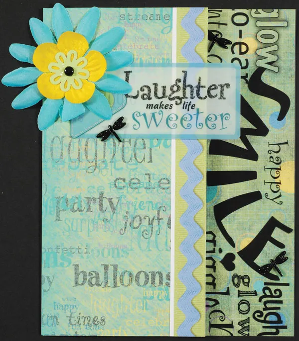 Cut the blue rickrack ribbon border (paper) to 6½" long and mat the long left edge with white paper. Glue the border along the right edge of the words piece. Cut out the "laughter" overlay art and use vellum glue to attach it to the words piece, 1" from the upper edge and extending 5/8" beyond the right edge. Add a dragonfly brad at the lower left to secure it as shown.
