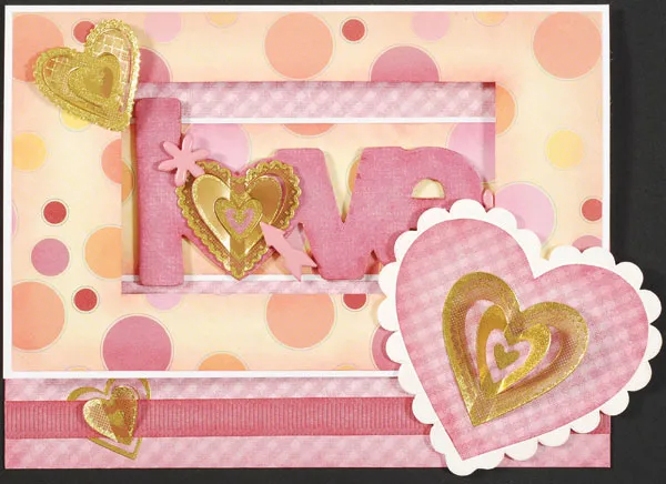 Cut a 7" x 1 5/8" piece of the yellow circles paper, chalk the edges, and mat the long edges on white. Cover the "love" chipboard piece with pink textured paper and chalk the edges red. Glue it to the center of the circles piece. Add a 1¼" Dazzles heart to the center of the "o", then add the flower and an arrow brad near the letters as shown. Glue the strip to the inside back so "love" is centered behind the opening when the card is closed. Trim any excess.