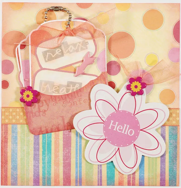 Hold the tag book over the inside back and fold the front up over it. Wrap the side flaps around the book to the pocket back, folding them. Remove the book and glue the flaps in place, allowing extra space for the thickness of the tag book. Glue the pocket to the front, positioned as shown. Fold a 1½" ribbon length in half and glue the fold at the top of the hello tag. Attach a pink flower brad through the tag hole, then glue the tag as shown.