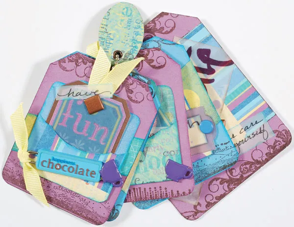 For the fifth tag: Stamp brown scrolls along the upper and lower edges of the large purple tag. Cut a 3¼" x 2¾" piece of the yellow/blue border paper, positioning the border along the right edge. Ink the edges brown. Cut out the "laugh" square from the overlay sheet and glue it to the piece at the upper left. Ink "eat chocolate" brown, then glue it across the yellow piece, angled as shown. Add the two square copper brads to the piece, positioned as shown.
