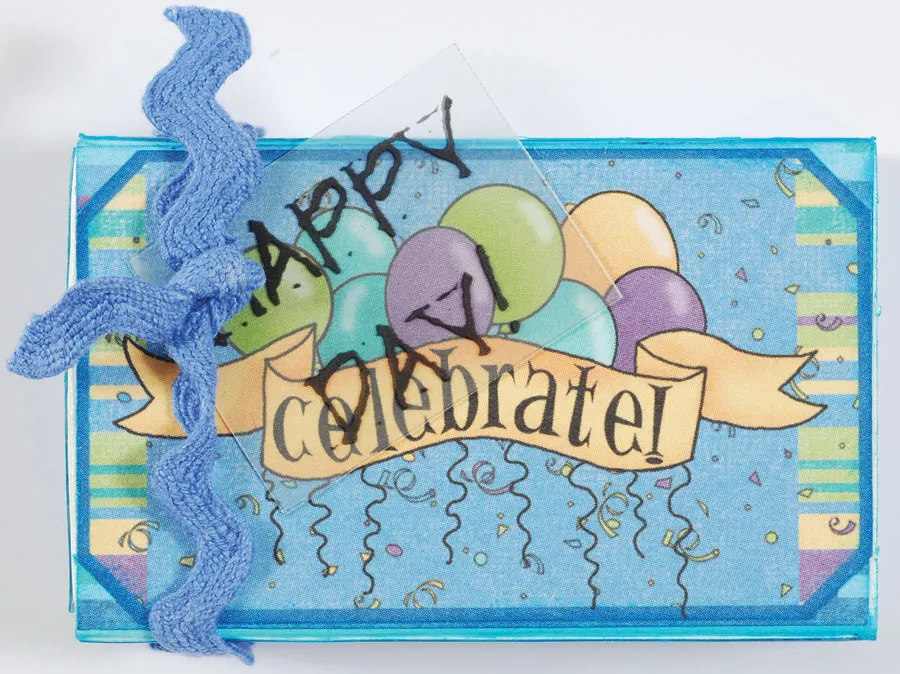 Cut out the "age" percentage tag and the small birthday cake art and glue them to the bottom, positioned as shown. Cut out the "celebrate" art and glue it to the top. Cut out "happy day!" from the Vinyl Word Blocks and use vellum glue to attach it to the top, angled upward from the top left corner as shown. Wrap the lid with blue rickrack and knot it on the lid near the left end as shown.