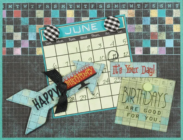 Cut out a blank calendar and the appropriate month. Glue the month at the top of the calendar and write the dates in the blank squares. Circle the birthday several times. Mat the calendar on teal cardstock, ink the edges, and glue it to the black piece, angled in the center as shown. Add a black plaid brad on each side of the month.