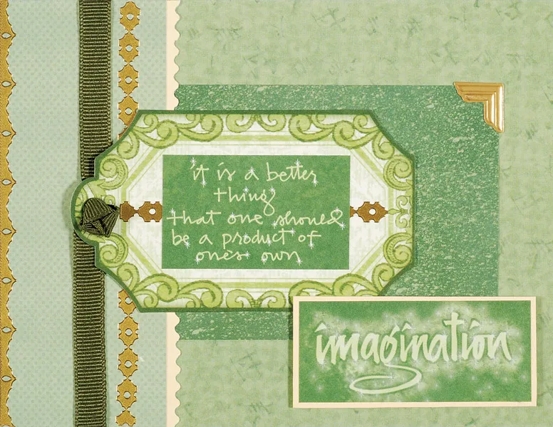 Place a 3" length of the square border Dazzle™ across the tag. Cut out the Word Garden quotes and glue “it is a better thing…” to the tag. Mat “imagination” on Heritage cream cardstock with 1/32" borders, then foam tape it to the front as shown. Punch out and glue a gold embossed corner to the upper right corner of the spattered paper.