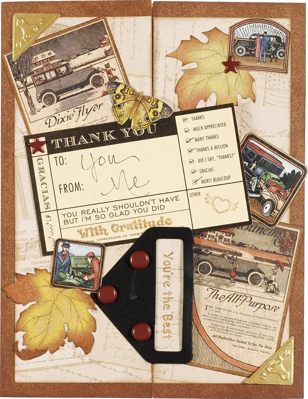 Attach a brown star brad to the upper left corner on the “Thank You” label. Fill in the blanks, then stamp “with gratitude” and a flying heart as shown. Glue to the left front, angled over the right panel, with the lower edge tucked under the file tab. Cut out the Nature leaf and Posters label shown at the upper right, ink the edges, and glue together. Insert a brown star brad between them, then glue to the panel. Cut out, ink, and glue the remaining Posters labels, Nature leaves, and butterfly as shown. Punch out the embossed gold corners and glue as shown.