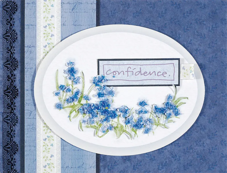 Bend up the edges on the oval’s die cut flowers. Squeeze dots of glue on the flowers without completely covering them. Sprinkle Flower Soft onto the glue, press in place, then shake off the excess. Let dry. Cut out Word Garden “confidence” and mat on navy cardstock with 1/32" borders. Cut a 1½" paper ribbon length and gently fold in half. Glue it under the right end of “confidence,” then glue to the oval at the upper right. Foam tape the oval to the card as shown. Punch out a flower cluster and bend up the flower edges. Add Flower Soft, let dry, and glue to extend over the lower left corner of “confidence.”