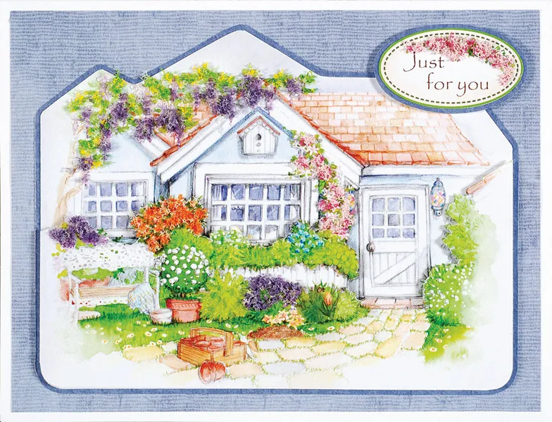 For the inside: Cut a 6¼"x4¾" Textured lavender paper and glue centered on the inside. Cut out the second full-size cottage and glue to the lavender paper. Add pink Flower Soft to the flowers on the “Happy Birthday” label, let dry, and foam tape at the lower right.