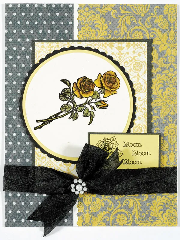 Cut 2"x1" yellow cardstock and stamp the small rose blossom and “bloom” three times with black ink. Mat on gray cardstock with 1/32" borders, then foam tape to the front, tucking it under the ribbon as shown. Tie a ribbon bow and glue 2" from the left edge, then place a pearl flower in the center.