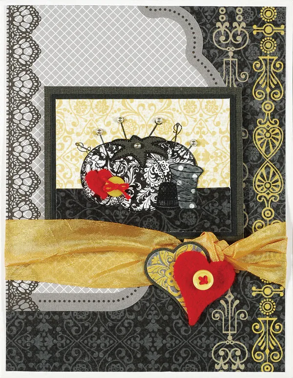 Stamp the pincushion on cardstock and cut out just the heart, then use as a pattern to cut a heart from felt. Glue it to the yellow/black pincushion. Glue a 3/8" button on the stamped button, then tie a thread bow and glue to the button. Trace and cut an H5 heart from Sunshine & Shadows gray/yellow paper and mat on gray cardstock with 1/32" borders. Cut an H5 heart from felt, then glue both as shown. Thread a 1/4" button and glue to the felt heart. Place the pearls as shown.