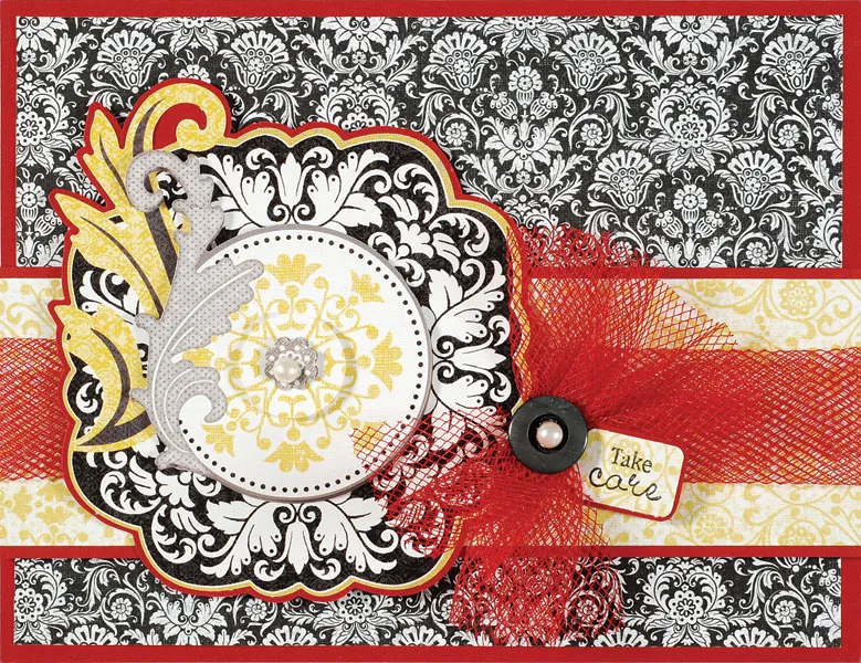 Punch out the medallion papier tole pieces and mat piece #1 on cardstock with 1/32" borders. Foam tape piece #3 in the center, then foam tape pieces #5 and #6 on top. Glue to the border, foam taping the overhanging edges. Cut two 3" tulle lengths and stack. Pinch the center and tie with thread to secure. Glue as shown, then glue the button on top. Punch a small tag from Sunshine & Shadows white/yellow paper and stamp “take care” on it. Mat on cardstock with 1/32" borders then glue as shown. Place pearls on the medallion and button centers.