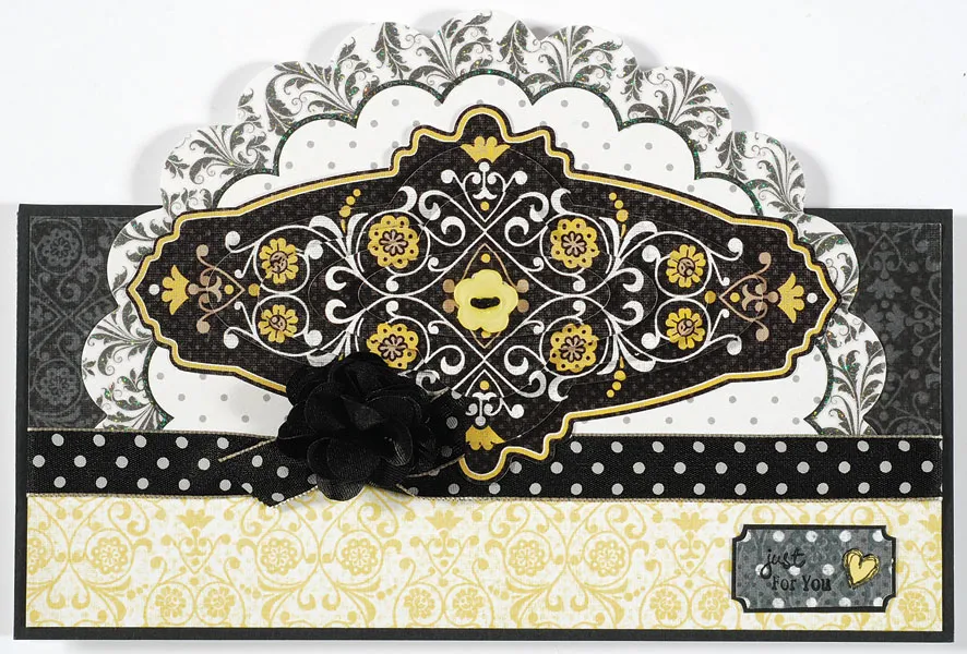 For the card front: With the card opened flat, score and fold in half lengthwise, making a 10"x3 1/4" card. Trim to 7"x3 1/4", then cover the front with black cardstock. Cut 6 3/4"x3" Sunshine & Shadows black damask paper and 6 3/4"x1 1/4" Sunshine & Shadows white/yellow paper. Glue the white/yellow paper along the bottom of the black damask paper. Wrap 1/2" wide black/white polka dot ribbon over the seam, gluing the ends on the back. Glue the paper centered on the front.