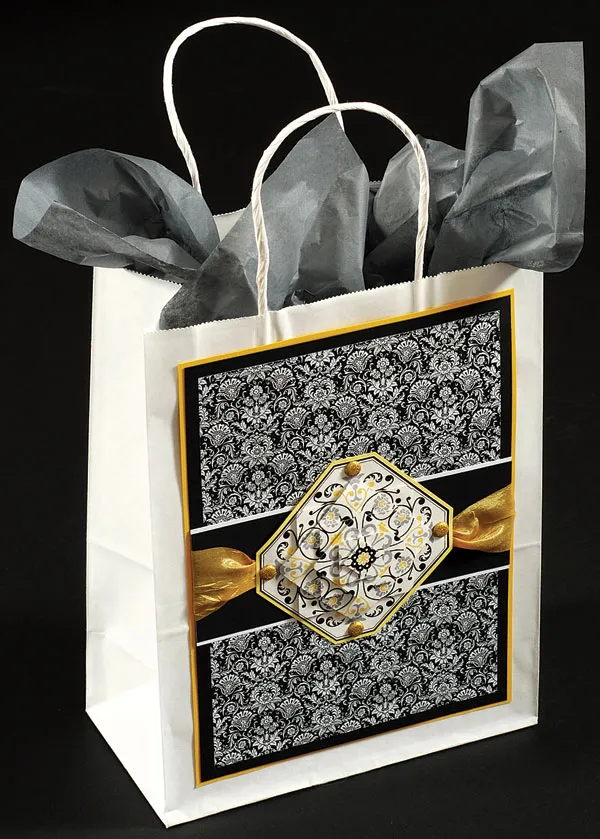 For the gift bag: Cut 6"x8 1/2" Sunshine & Shadows black/white paper and mat on black cardstock with 1/4" borders. Cut 6 1/2"x2 1/4" black cardstock and mat the long edges on white cardstock with 1/8" borders. Glue across the center of the black paper.