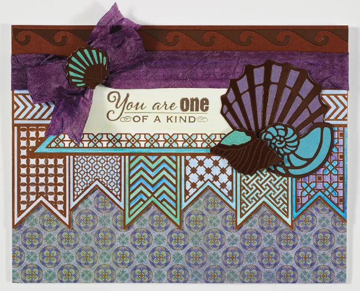 Cut out the Color Me™ square blank label and color the center as for the label on the front. Color the frame light blue, then brush the label with water. When completely dry, turn it on point and stamp “my kind” across the center. Mat on teal cardstock with 1/16" borders, then glue centered below the banner. Back a 1" Dazzles™ shell on purple cardstock and a 1¼" shell on blue cardstock. Glue the shells at the lower right, then place small Dazzles™ shells near them. Place the Dazzles™ scrolls on the upper corners.