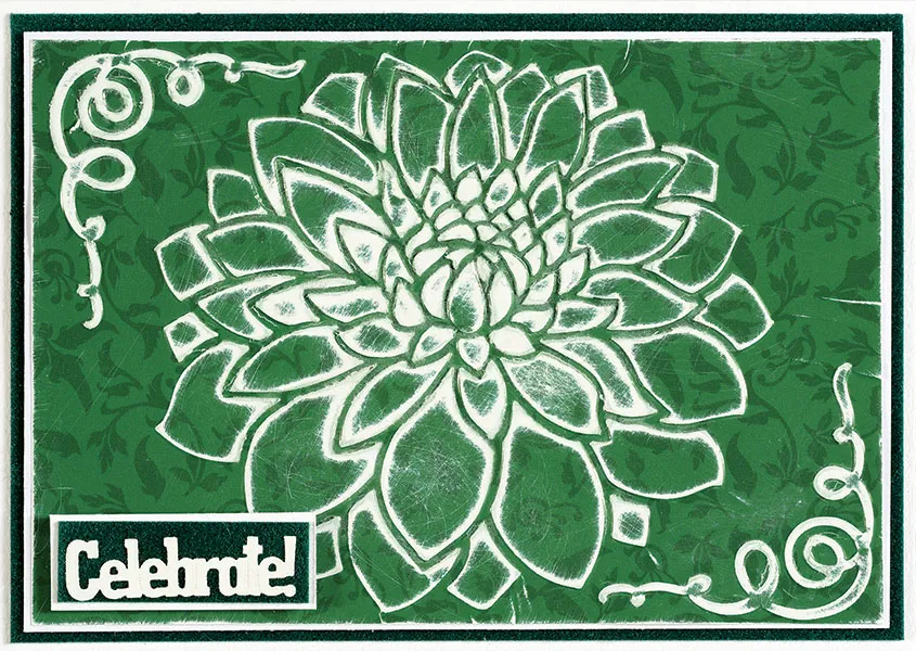 Place a 5 7/8”x4” Green Flourish paper in the embossing folder. Run through the machine. Lightly sand the raised areas, until they turn white. Mat on white cardstock with 1/16” borders. Glue to the card front centered.