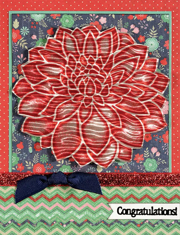 Card Front: Place the Red Holographic paper in the Dahlia embossing folder white side up and the black printed Dahlia on the outside front. Run through the embossing machine so that the flower petals are de-embossed. Lightly sand the surface of the flower and cut out 1/16" around the outside edges of the flower. Place the card fold on the side and cover the 4 3/4" with red dot paper and the remaining portion with chevron paper. Ink edges of 4 1/4" x 4 1/2" blue floral paper and mat with aqua cardstock, leaving 1/16" border and centered above the chevron border. Foam tape the dahlia to the blue floral paper as shown and glue a length of red velvet glimmer ribbon across the top of the chevron border. Knot a length of blue grosgrain ribbon and Zot™ to the right as shown. Place "Congratulations" Tiny Words & Phrases Dazzles™ on a 1/2"x2" white strip of cardstock and cut a "v" shape on the left end and ink edges. Glue even with the right side of the card, 1/2" from the bottom edge.