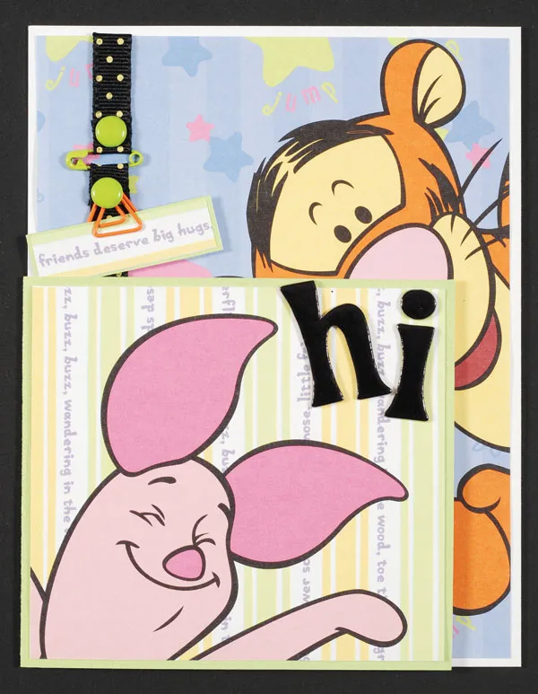 Cut the Piglet image into a 4 1/8" x 3¾" piece. Glue it centered on the lime front flap. Adhere chipboard stickers spelling, "hi" to the flap above Piglet as shown.