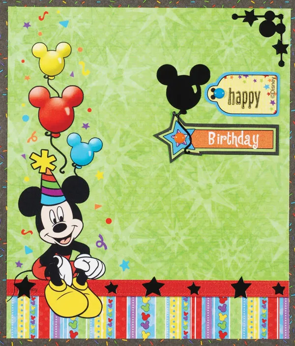Cut the green Mickey border piece to 4¾" x 5½". Punch out the yellow tag and the "birthday" word art. Mat the word art on black. Stamp "happy" on the tag. Glue them to the upper right area of the border piece, along with a Dazzles Mickey balloon sticker. Add mini brads to the tag and word art.