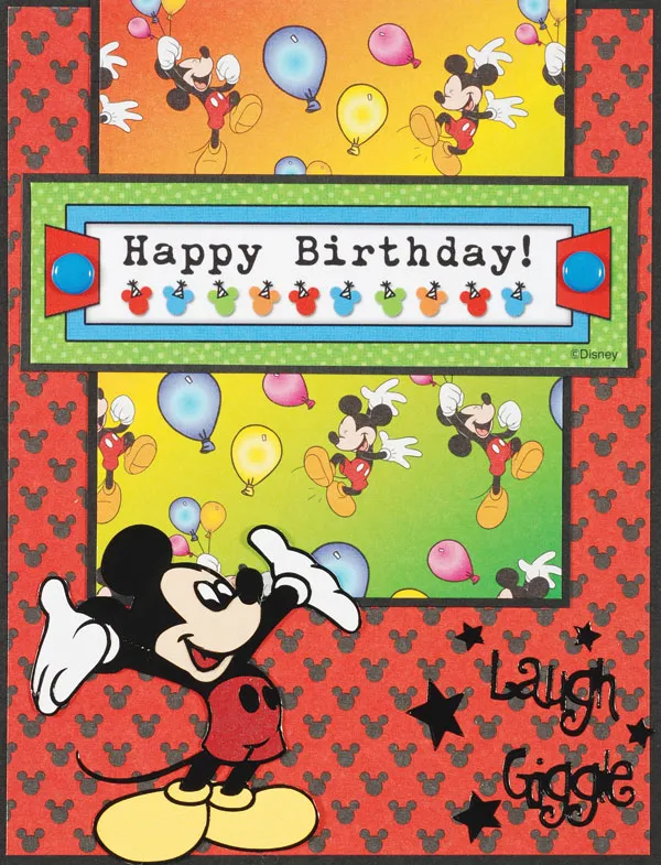 Cut a 3½" x 4½" piece of the partying Mickey paper and mat the sides and bottom with black. Glue it to the red/black piece, aligning the upper edges. Cut out the "Happy Birthday!" greeting and mat it on black. Glue it across the card front, 1¼" from the upper edge, then add a blue brad to each end as shown.