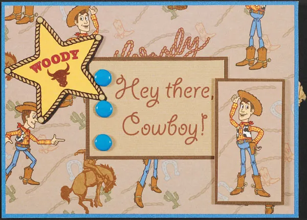 Cut out a Woody image from the cowboy paper and mat it on brown. Add foam tape to the back, then adhere it to the front at the lower right. Cut out the star and glue it to the upper left as shown.