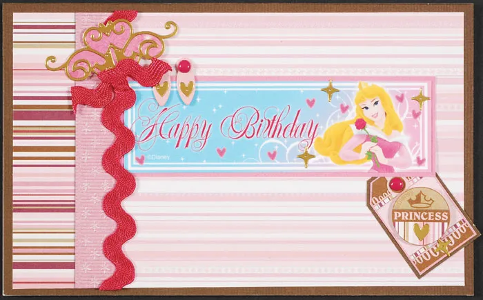 Add two pink turn mounts at the top of the greeting with pink mini brads. Cut out the pink tag and mat it on brown. Glue the tag to the constructed front, positioned under the right end of the greeting. Cut out the "princess" circle, add foam tape to the back, and adhere it to the tag, positioned as shown. Add Dazzles stars and hearts to the greeting, tag, and turn mounts.