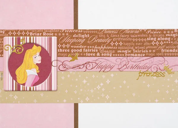 Cut a 3" x 5¼" piece of the pink sparkles paper and mat the right long edge with brown cardstock. Glue it to the envelope front along the left end. Cut the Snow White border paper to 7¼" x 3", positioning the border at the top. Glue it centered across the envelope.