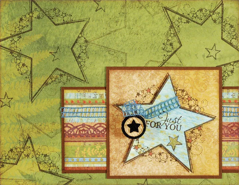 Cut a 4¾"x2¼" Nature’s stripes and mat all but the right side on brown cardstock with 1/16" borders. Glue a 5½" ribbon across the piece, gluing the ends on the back. Glue to the front, ¼" from the lower edge. Cut a 3"x2 7/8" Nature’s tan ferns paper and ink the edges. Mat on cardstock with 1/16" borders. Stamp the star frame in the center, then glue over the stripes, ½" from the right edge.