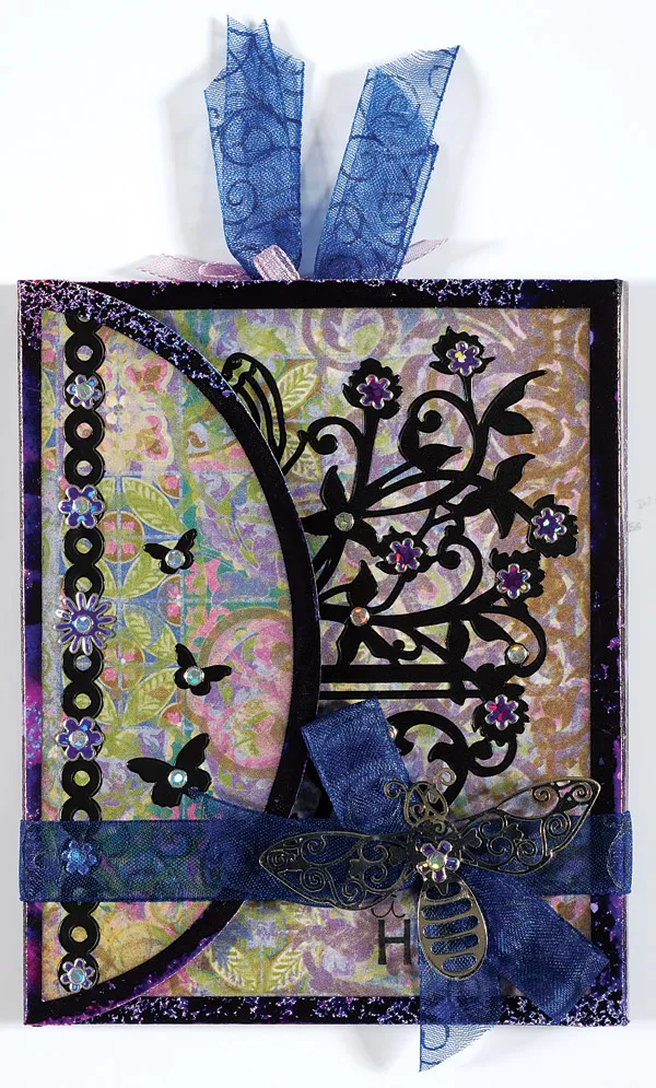 Stamp “a warm hello” in the lower right corner of a Batik tiles paper. Place the butterfly swirl and jewel Dazzles™ on it as shown, then glue to the third panel. Glue the last tiles paper to the fourth panel. Trace and cut a flap pattern from Batik tiles and ink the edges purple. Place the Dazzles™ circles border along the straight edge and three butterflies flying on the right. Place the jewel and flower Dazzles™ as shown, then glue to the flap.