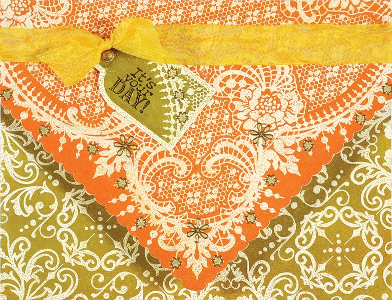 For the card front: Turn the card with the fold at the top. Trace and cut the pattern from one corner of the Lace Color Me paper. Place in the box and spritz with carrot cake ink. Remove and wipe the ink from the raised areas with paper towels. Glue ribbon across the paper near the upper edge and glue the ends on the back. Glue the lace corner to the card front, aligning the longest edge with the car fold. Trim the lower edges with scallop-edged scissors.