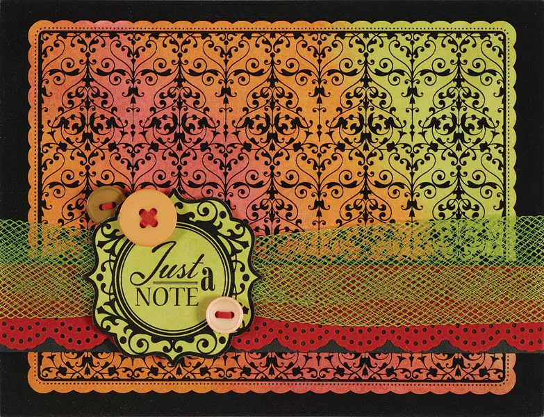 For the card front: Turn the card with the fold at the top. Place the Damask card topper on the craft sheet and follow the directions above to ink, beginning with guacamole at the upper right corner. Change to candied yam, then to red barn, and finish with candied yam at the lower left corner. Let dry, then glue to the front, leaving the lower half unglued.