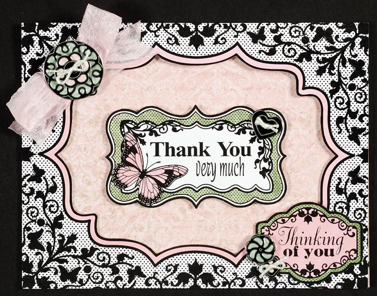 For the inside: Cover the inside with Handmade Memories pink paper. Cut out the Butterflies “thank you” label, then paint the butterfly pink and the frame green. Foam tape to the inside, centered in the window when the card is closed. Place the Dazzles™ border as shown. Foam tape a heart button to the label at the upper right, then glue knotted thread in the center.