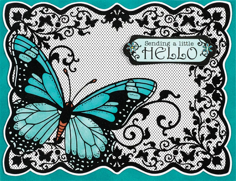 Cut a 6 1/2"x 1/4" cardstock strip and glue to the border as shown. Place flower Dazzles™ on the border flowers. Cut out the Butterfly “just because” and a small butterfly. Color the butterfly as for the front and the outer frame on the label with turquoise BT5 pen. Glue as shown.