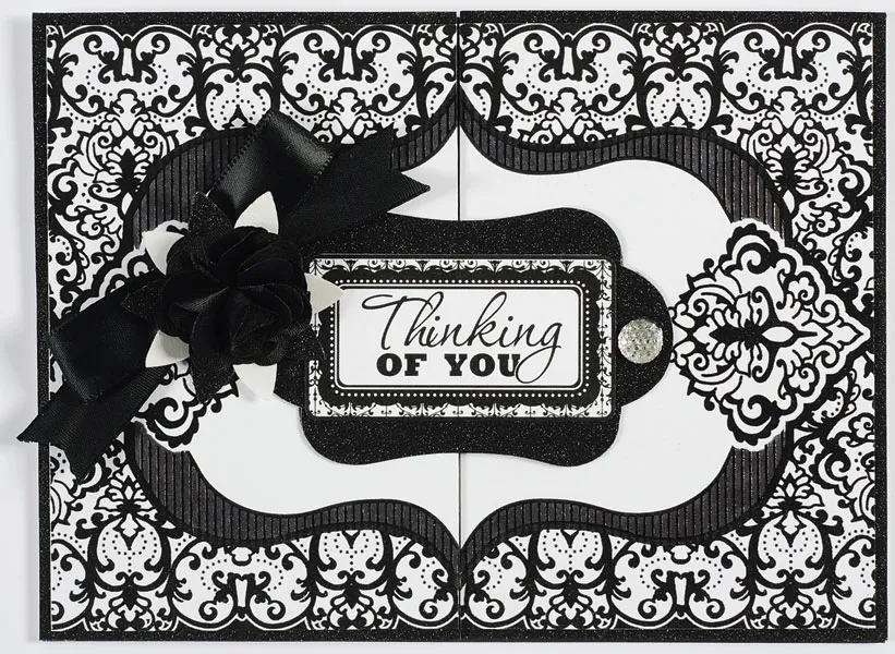 Cut the Damask card topper to 6 1/4"x4 5/8", then cut in half. Use the black pen to color the striped frame area, then glue both pieces to the front flaps, meeting at the center. Trace and cut a 2"x3 1/4" inner label from black glitter paper and back with black cardstock. Glue centered on the front, gluing just the left half to the left front. Cut out the Damask “thinking of you" label and glue to the glitter label.