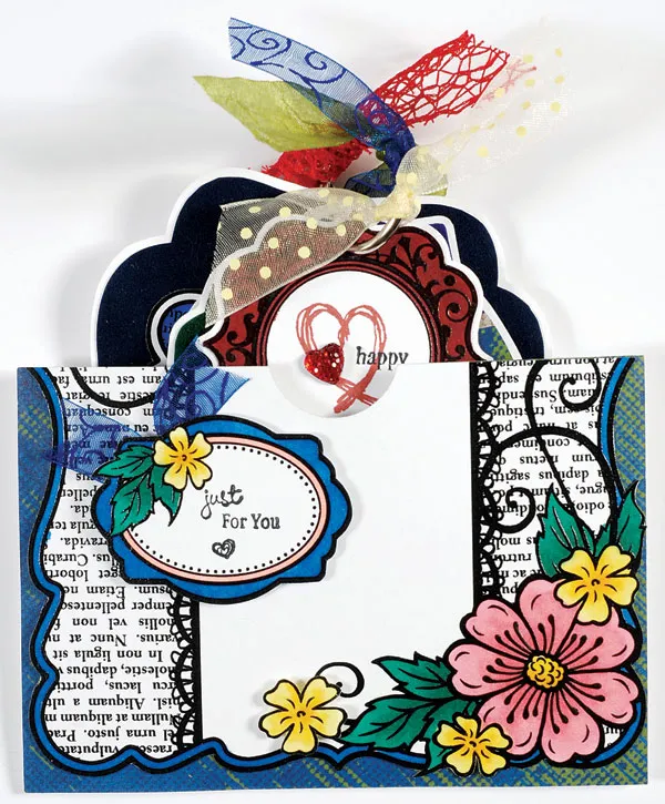 Punch a half circle centered in the front top edge, then use tape to secure the pocket tabs to the inside back. Cut out the Floral small flower, color as for the yellow flowers, and foam tape as shown. Cut out the Floral 2" blank tag and color the frame with TB8. Color the inner frame with CR4 and the flowers as for the pocket front. Stamp “just for you” and a small heart with black. Knot a 3" ribbon, trim the ends, and glue to the tag back at the upper left. Foam tape to the pocket as shown.
