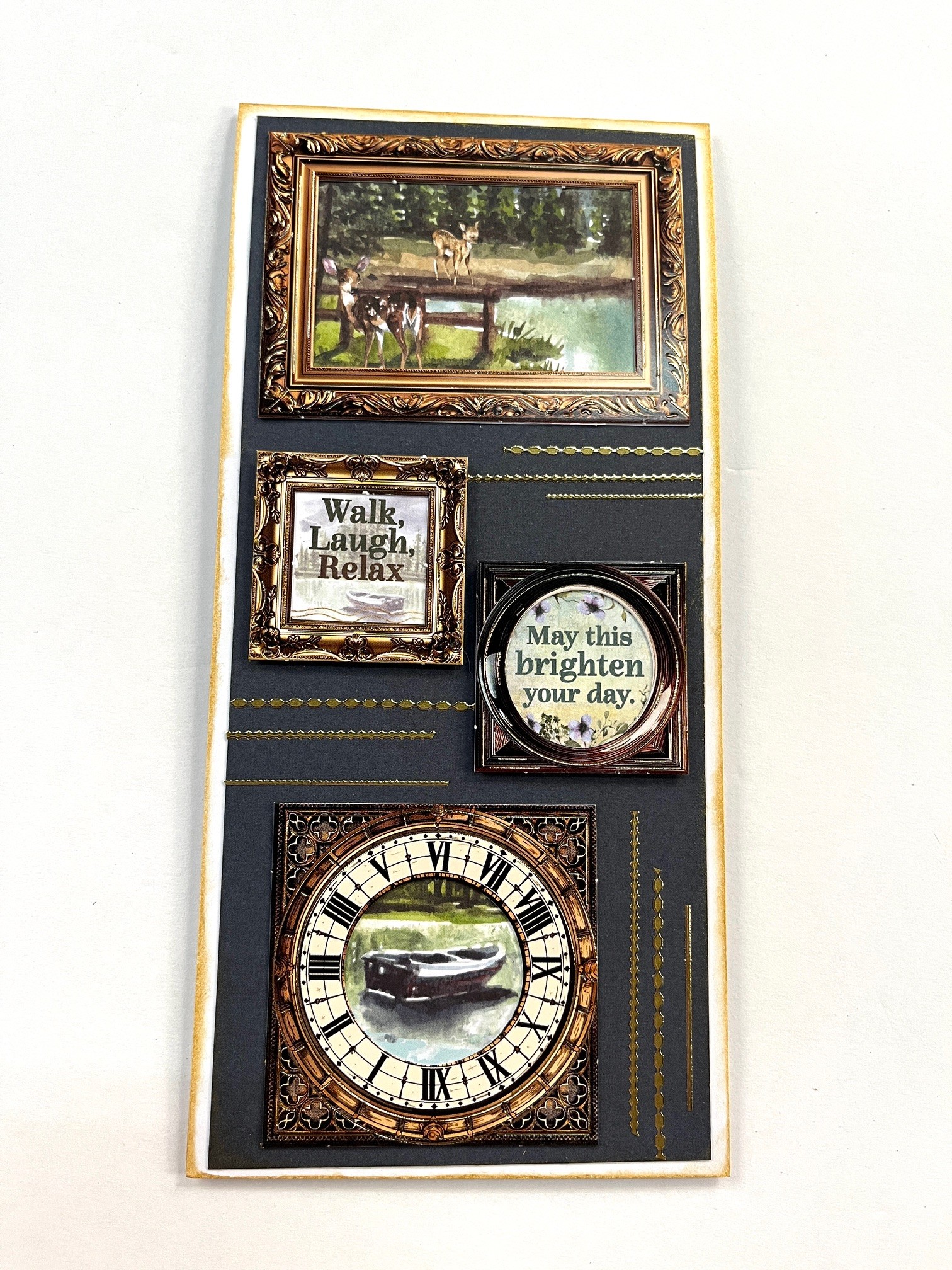 Cut a 3 1/2”x 8” blue At the Lake 12x12 Solid Cardstock and tape to the card front leaving a 1/8” white border. Ink Delicata gold ink pad directly to card on all borders. Select various images and sentiments from the 6”x6” Patterned Cardstock and tape to the back of the frames. Tape the top and bottom frames directly to card front and foam tape the ones in the middle. Place gold Thin Line Dazzles™️ as shown.