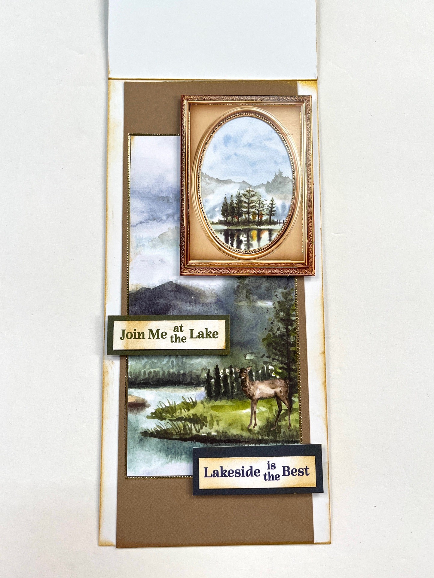 Tape the lake scene to the large frame and foam tape 1/4” from top and 1/8” from the right side. Again, ink directly with Delectica gold ink pad to paper all around the card edges. Cutout, ink and foam tape “Join Me at the Lake” and “Lakeside is the Best” sentiments as shown.