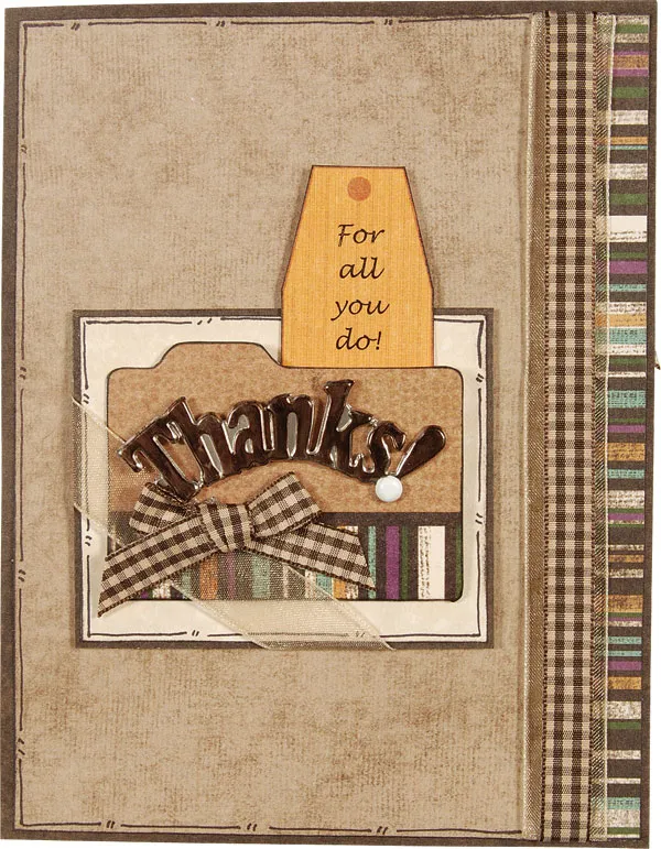 Place the 'Thanks' Brad Buddy™ on scrap paper, then press the brown inkpad onto the surface. Repeat until you have the coverage you want. Let dry, then secure to the front of the file folder with the white mini brad and glue dots.