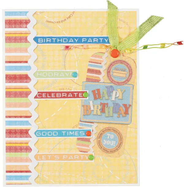 Cut out the following word art pieces and mat each on white: "birthday party," "hooray," "celebrate," "good times," and "let's party." Place the pieces along the border until you like how they look, then mark where you'll need to cut so you can insert the left end of each piece behind the rickrack border. Use the knife to make the short cuts, following the right edge of the rickrack. Slip each word in place and glue to secure.