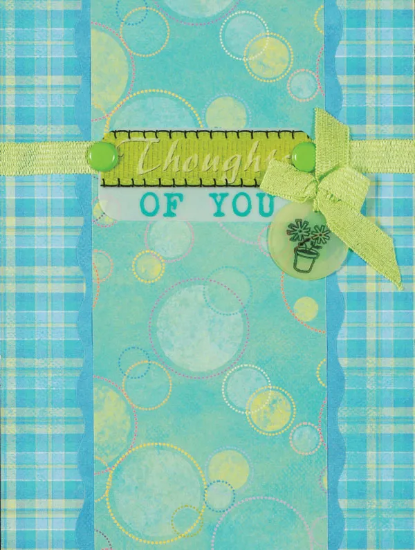 Glue a 5" length of the lime fiber across the plaid piece, 1½" from the upper edge, and glue the ends at the back. Cut out the lime "thoughts of you" vinyl art and use the Chomper to trim the corners. Glue it to the ribbon center, then secure each end with a lime brad. Glue the constructed piece to the blank card front.