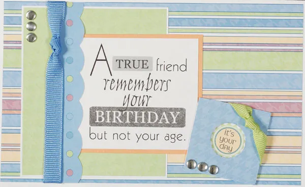 Cut a 3" x 3½" piece of the lime houndstooth paper and mat it on white. Glue it to the stripes, 3/8" from the left end. Cut out the "a true friend…" quote and mat it on orange. Glue it to the lime piece, positioned as shown. Cut a 1" x 3 7/8" piece of the blue dots paper and trim the right long edge with the scalloping scissors. Glue the strip to the striped piece, 1" from the left end.