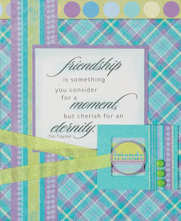 Cut the "friendship is something…" quote to 2¾" x 2½" and chalk the edges and largest words blue. Mat it on purple textured paper, then glue it to the plaid piece, positioned 1 1/8" from the top and ¾" from each side edge.