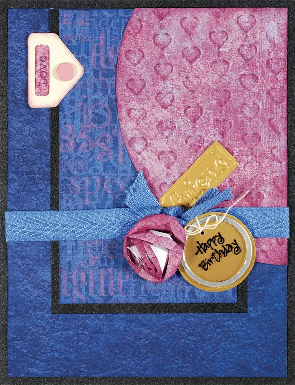 Glue the rose “stem” under the twill, then knot a 3" twill and glue over the stem. Cut out the embossed gold circle and “friend” tags. Hold the “happy birthday” tag over the gold circle and punch through both at the top. Tie them onto the twill together with the thread. Glue “friend” above the rose as shown.