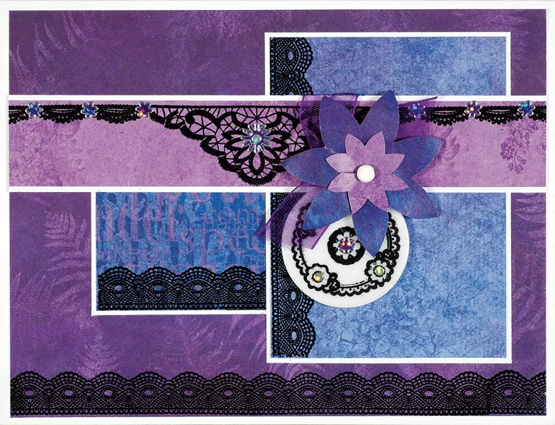 Cut a 6¼"x1" Jewel purple flowered paper and mat the long edges on white paper with 1/32" borders. Emboss the 2¾"x1" lace motif just slightly left of center. Emboss a ¼" lace border on each end. Emboss the lace circle and the ½" flower on the white disk. Use purple sheer ribbon to tie the disk onto the border just right of the motif, then glue the border to the front as shown.