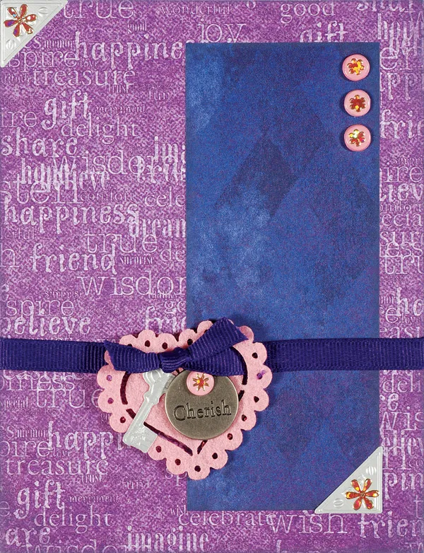 Insert a pink brad in the metal “cherish” tag. Punch out the 1" silver key and glue both to the heart. Glue two silver corner punch-outs to the front, then place the Dazzles™ as shown.